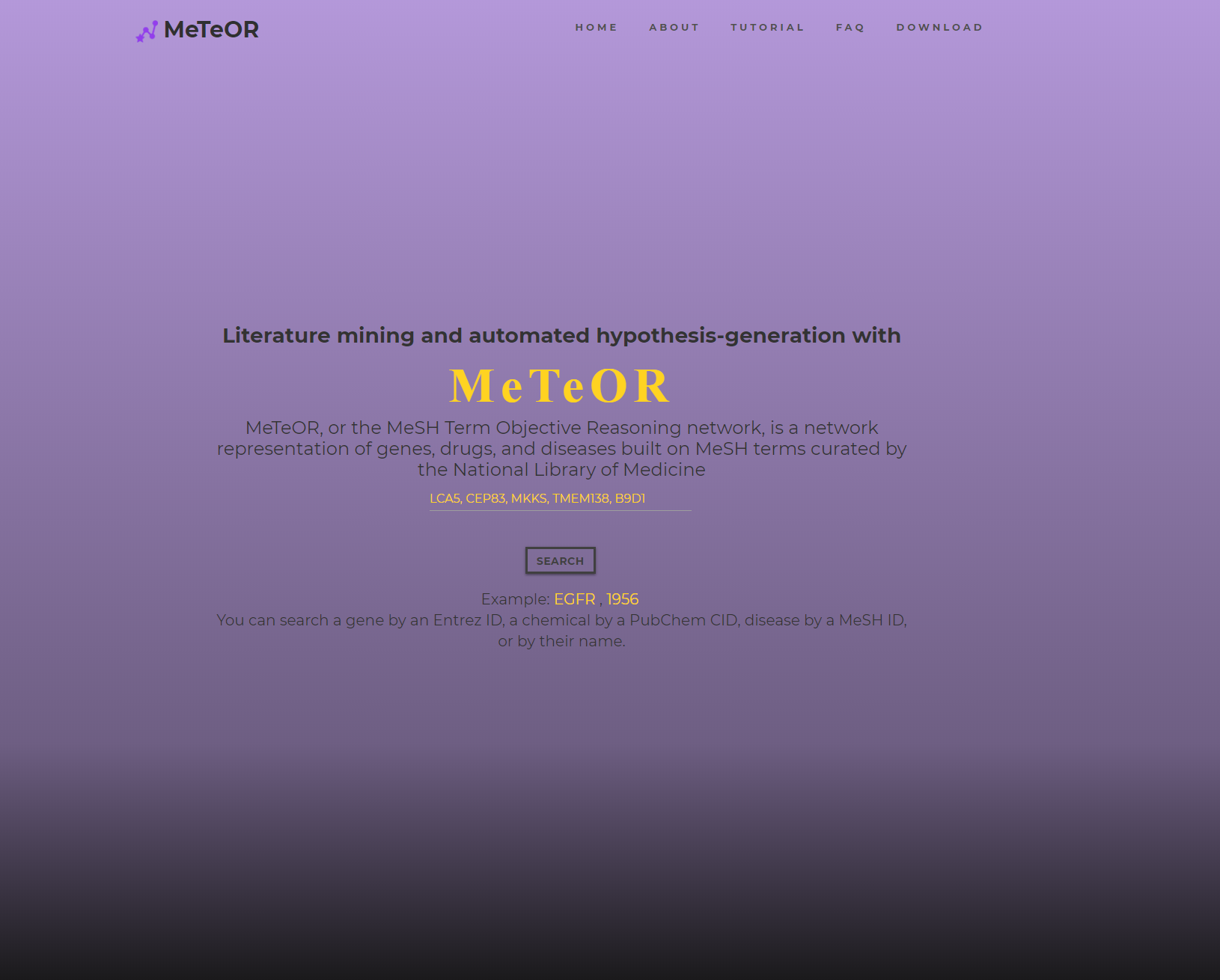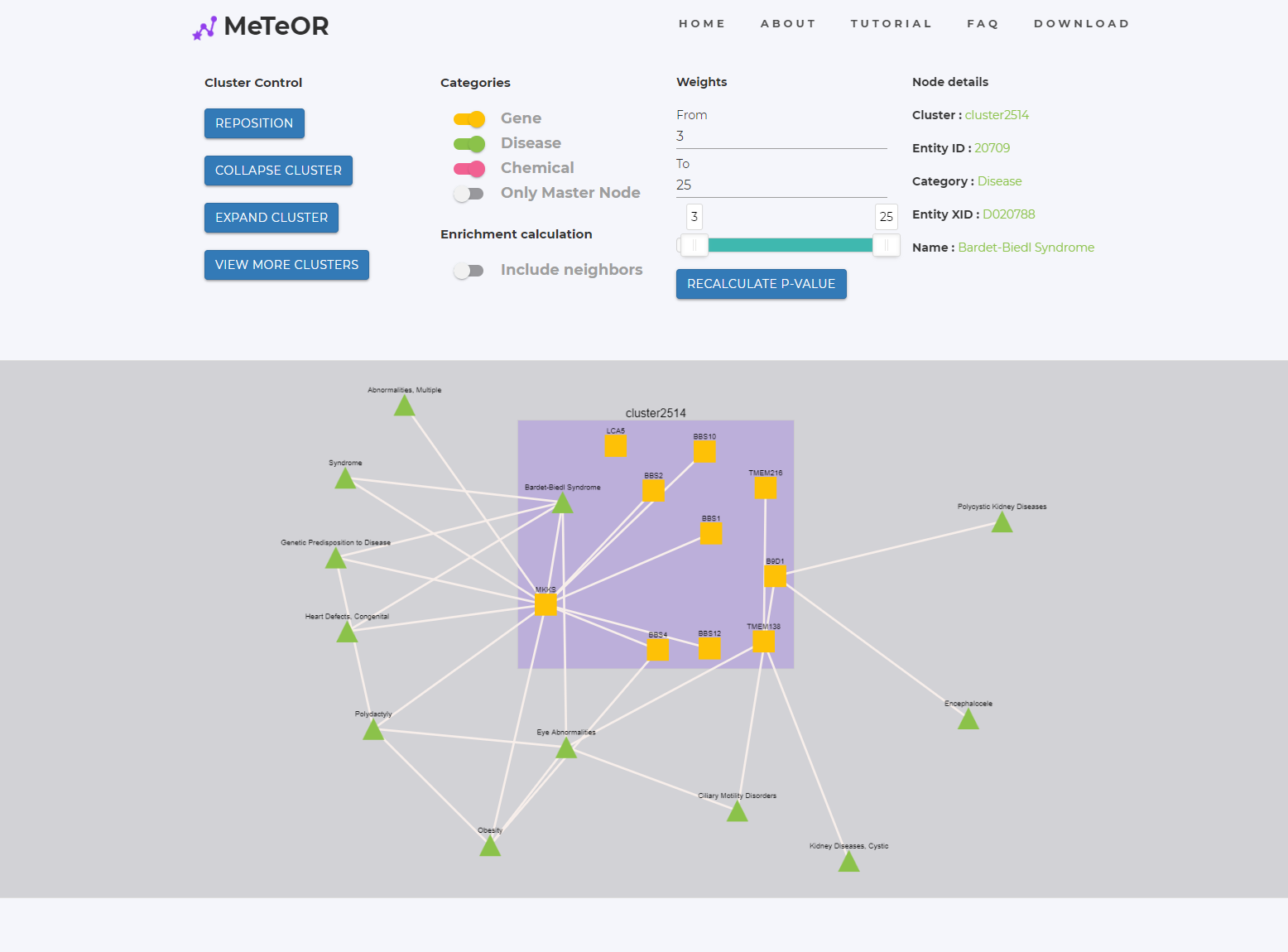 Type you’re your query into the search bar (a) and then select the entities of interest (b). If you are interested in a single entity and its neighbors, please select ‘METEOR’. If you are interested in viewing multiple entities and testing whether they are highly enriched in predefined communities/clusters in the MeTeOR network, please select ‘METEOR (CLUSTERING)’.