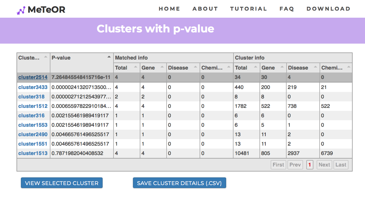 You can hover around a node to view their details. A shaded purple box is a cluster that your entities are highly enriched in. You can ‘reposition’ the network view, ‘collapse’ and ‘expand’ the identified clusters. There might be more clusters that your entities of interest are enriched in. To see them and their statistic details, please select ‘VIEW MORE CLUSTERS’. Results are shown in (d). You can click on the cluster ID to view specific genes, diseases, and chemicals that the cluster contains. In (c), you can also expand the enrichment analysis with direct neighbors of the entities of interest by turning on ‘Include neighbors’ and clicking ‘RECALCULATE P-VALUE’.